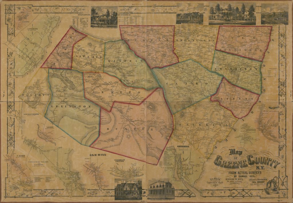 This acreage was carved out along an east-west ridge of the Catskill Mountains — and appears as in indent in the upper left of the Greene County map above. The land south of the mountains remained in Greene County, while the land to the north went to Schoharie County. In 1836, the ceded area bordered three Greene County towns: